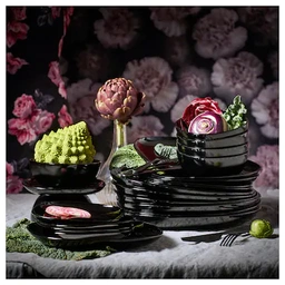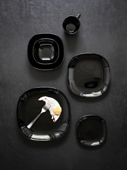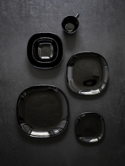 غذا همیشه خوشمزه به نظر می رسد که روی این ظروف براق سیاه و تیره سرو می شود.